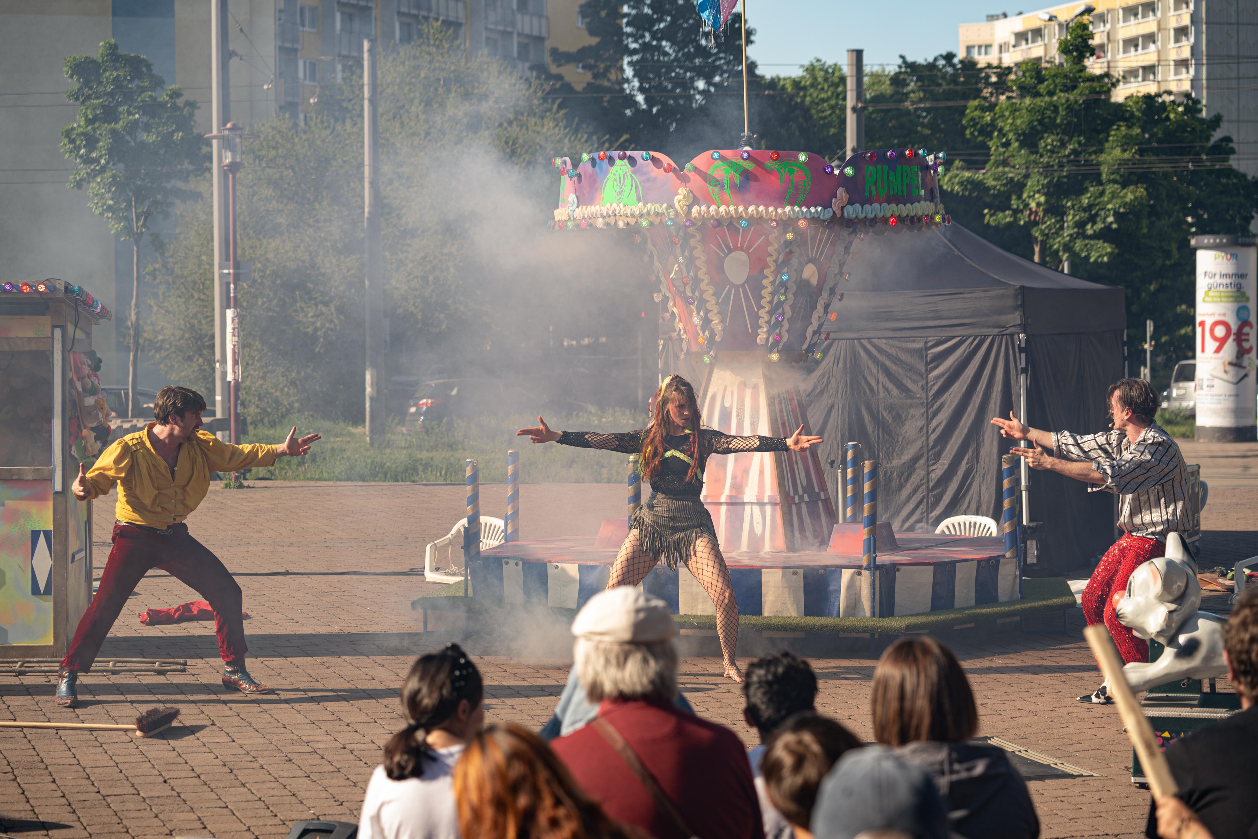 "Das fahrende Theater Rumpel Pumpel verwandelt am späten Abend den Herderplatz mit seinem Stück in ein Tollhaus. „Das Hotel im Karussell“ ist eine wilde Komödie, Straßentheater fürs Herz."